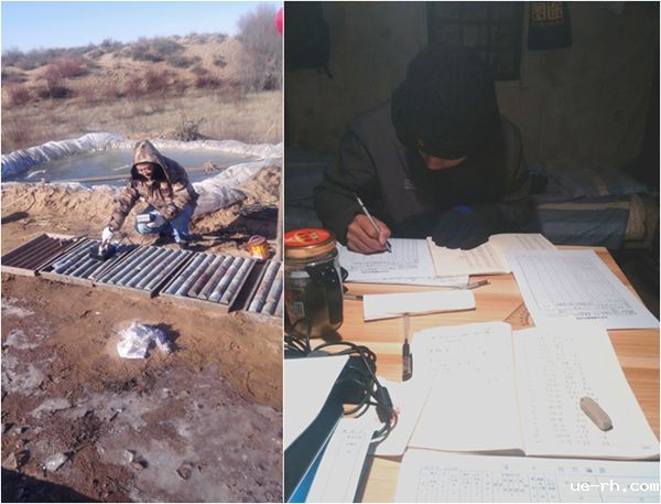 转眼之间,就到了十一月的尾声。随着西北风呼啸而至,那是一种刺骨的寒冷,在这滴水成冰的荒漠里面,一边听着寒风的催促声,一边用冻僵了的手指认真的记录着。在零下五、六度的室外,吹着寒风编录完一天的岩心时,整个人都好像不是自己了,冻的双手、双脚没有了知觉。项目组王春晖说:他上新疆昆仑山时买了一条毛裤,当时也没有穿,没有想到在这里用上了;杨永年也是冻的没办法,头戴棉帽,脚上穿了两双毛袜子。