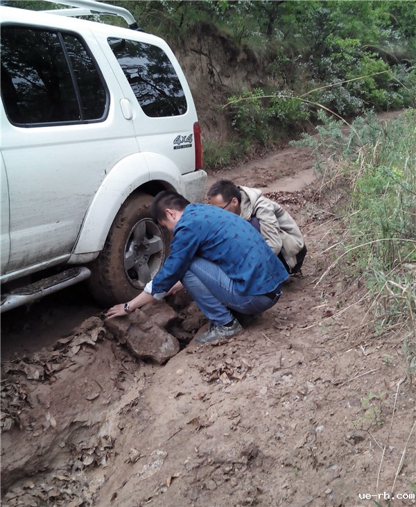 山里的雨来的快去的也快,大概二十多分钟后,雨驻了。我们下了车,从附近寻找大的石块,几个人合力搬运到车轮子底下,准备把车移动到平整一点的安全路面。车子一边慢慢滑动,我们一边不断地用石块垫着车轮子,就这样艰难地滑到了相对平一点的路段,为安全起见,项目负责王磊决定步行下山。关好了车窗,锁好了车门,只携带了部分重要设备,从距离山脚下约2公里的地方,我们步行开始下山。山高、坡陡、路滑,几个人只能小心加小心,踩着路边的野草和小石子,一步一步往山下走。