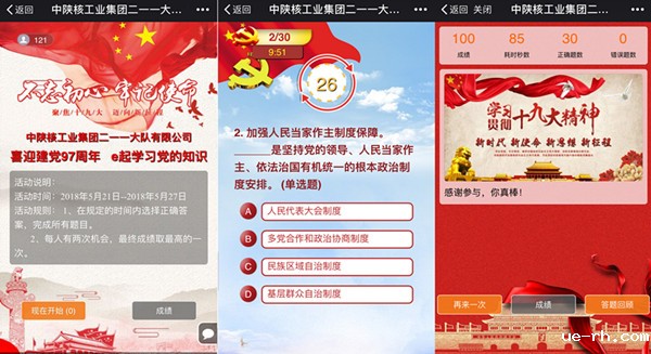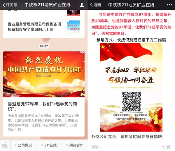 为喜迎中国共产党建党97周年,进一步强化基层党员对党的十九大和全国两会精神的学习贯彻落实,公司党委创新学习方式,以公司微信公众号为平台,在全体党员中组织开展了“互联网+党建”的“e起学党的知识”答题竞赛活动,同时编印下发了党建知识应知应会学习手册,在全体党员中再次掀起了学习十九大和全国两会精神的热潮。