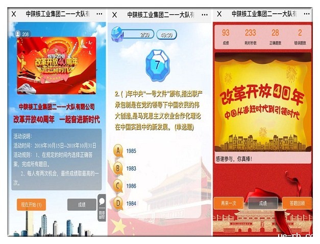 四是组织开展庆祝改革开放40周年在线知识竞赛活动。为进一步巩固学习效果,在公司微信公众号特开设“我要答题”知识竞赛栏目,围绕改革开放40周年的历史和党的十九大关于深化改革的相关知识,组织全体党员、入党积极分子、共青团员等积极参加答题活动。