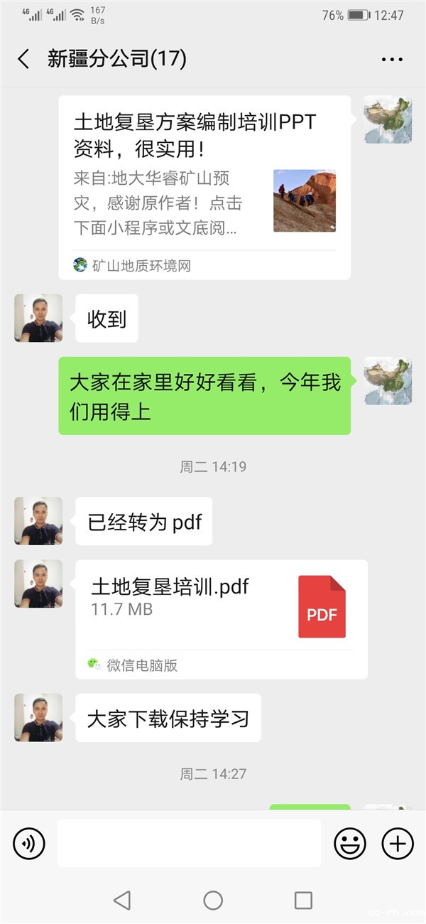 三是组织技术人员线上学习:结合新疆分公司目前业务需要,针对性学习《地质灾害群测群防》、《土地复垦方案编制》、《最新地质编录细则》、《矿山生态环境保护与恢复治理方案编制导则》等材料,进一步丰富技术人员业务知识,提升工作能力,适应专业工作转型发展。