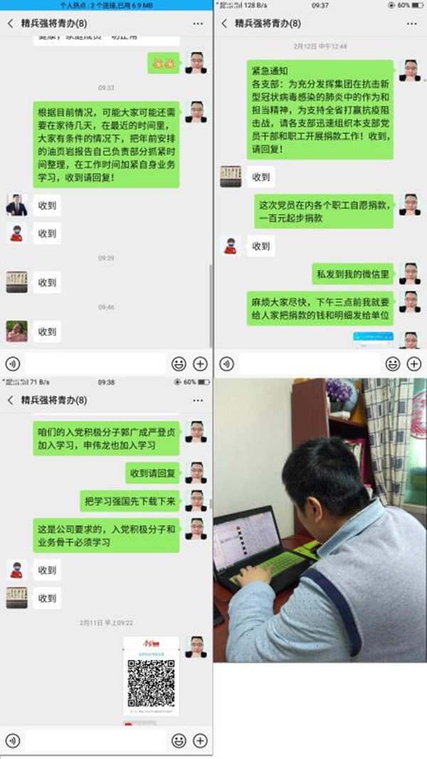 分公司在公司的统一安排下,及时传达集团公司和公司在疫情防控时期下达的各种文件,并要求职工认真学习和深入贯彻。为做好防疫工作,分公司通过学习强国、微信、电话等方式做好疫情宣传工作,目前分公司党员、技术人员都加入学习强国平台,通过学习平台加强自身思想素质。通过微信,分公司职工每天报告自身和家庭其他成员身体状况,是否与疫区人员有往来接触,并及时上报公司。在疫情期间,分公司要求职工按照公司及地方要求,积极配合疫情防控工作。在防控疫情的关键时刻,分公司党支部积极响应公司党委捐款倡议,为抗役工作尽自己绵薄之力。