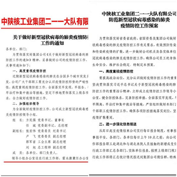 加强防控组织领导。公司下发《关于做好新型冠状病毒感染的肺炎疫情防控工作的通知》和《防范新型冠状病毒感染的肺炎疫情防控工作预案》,成立了疫情防控工作领导小组,同时成立了由公司党委班子成员带班的疫情防控后勤保障突击队,坚决扛起防疫责任,奋战在防疫一线。公司所属独立法人全资子公司或控股公司复工复产前成立由法人代表牵头的疫情防控领导小组,结合自身情况和职工留居状况,制定复工复产疫情防控工作方案和应急预案,按照程序上报审批。