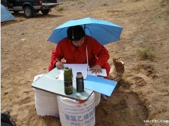 由于地形原因,只能轻装上阵,很多办公设备都没有带。大家急中生智,在袋子里面装满了沙子,上面放了个木板就成了我们的简易办公桌。夏日的太阳格外的毒,帐篷里面非常闷热光线昏暗,我们就在露天办公,太阳光太刺眼,我们就打把伞遮一下,继续工作。就在这种艰苦的情况下,同志们没有向困难低头,坚持、不放弃,克服了一个又一个困难。