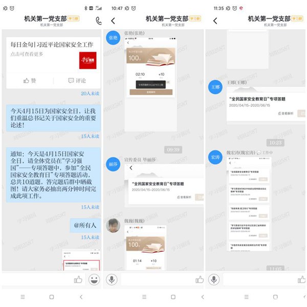 通知发出后,党员纷纷响应,积极参与答题,分享答题截图,并通过公司网站——法律法规专栏和微信公众号——纪检监察专栏学习中华人民共和国宪法、国家安全法、网络安全法等法律法规及国家安全教育知识,进一步树立“国家利益高于一切,国家安全人人有责”的国家安全意识。