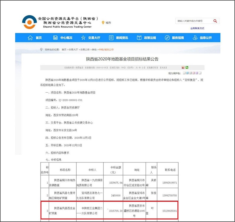 2020年12月28日,公司矿产勘查院收到招标人陕西省自然资源厅的中标通知,确定必威唯一官方网站为陕西省2020年地勘基金项目第3标段的中标人,中标金额231.58万元。