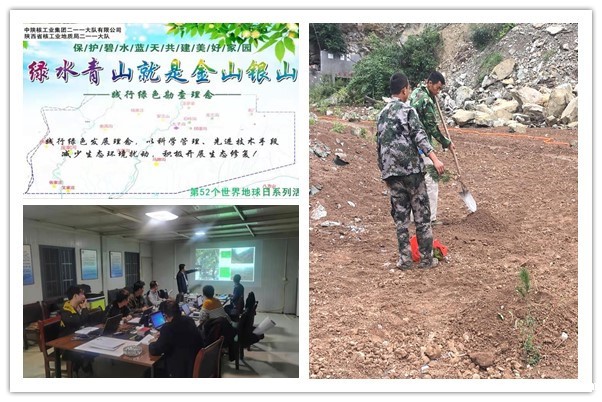矿产勘查院在凤县的全体项目成员在马蹄沟项目部召开了宣传会,支部书记叶奎同志通过多媒体介绍了“世界地球日”活动主题,并结合矿产勘查院工作实际情况领学了绿色勘查规范,参会同志们交流了工作中应注意的环保小妙招和工作经验。会后各项目成员在马蹄沟金矿东段勘查工作区实地开展了植树活动,通过实际行动,深入践行“绿水青山就是金山银山”的绿色发展理念,现场种植白皮松500余棵,播撒草籽10余斤。