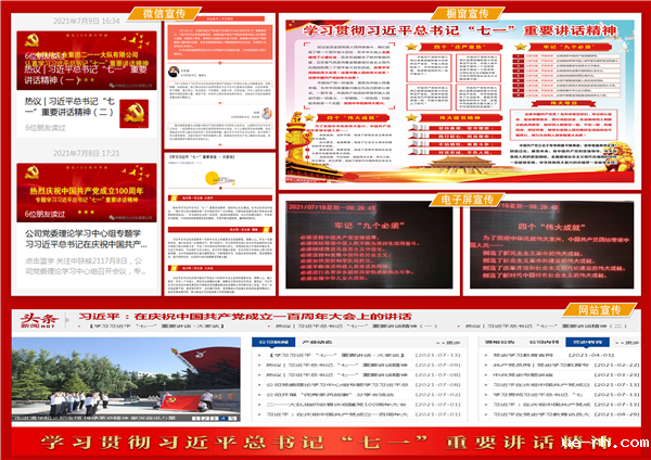 广泛宣传,多种方式推动学习。公司官网第一时间头条推送习近平总书记“七一”重要讲话原文,机关办公楼LED显示屏同步第一时间将总书记讲话的金句滚动播放,公司官微持续推送来自“共产党员”网等官方媒体的解读文章,帮助广大党员,尤其是野外一线党员的学习。积极谋划,制作宣传橱窗。7月14日,更换了办公楼下的宣传专栏,专版宣传习近平总书记“七一”重要讲话,小区的职工群众久久伫立认真学习。