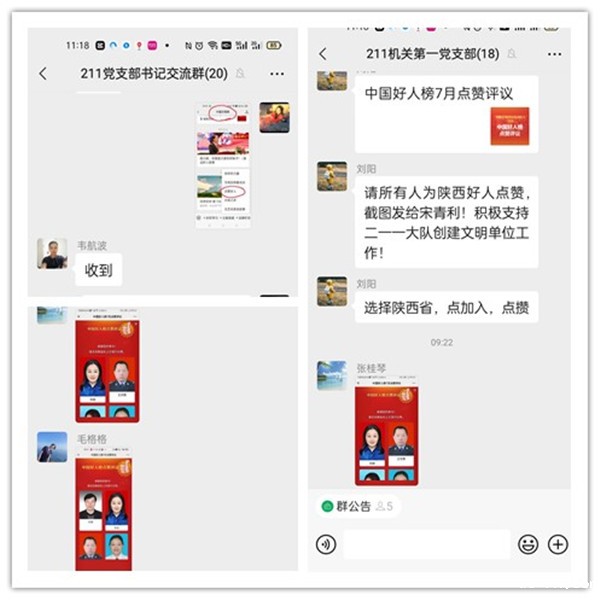 公司各支部收到通知后迅速行动,组织广大干部职工学习宣传中国好人候选人的先进事迹,积极参与网上点赞评议投票活动,干部职工通过“中国文明网”微信客户端,对陕西省推荐的助人为乐候选人“陈笑”“胡小军”“谭云”、敬业奉献候选人“苏丽”“王军鹏”、孝老爱亲候选人“张俊”“贺晶晶”、见义勇为候选人“柯勇”进行了点赞评议。
