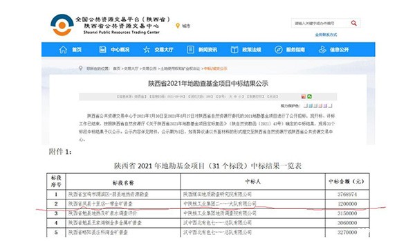 2021年9月6日,陕西省公共资源交易中心网站发布“陕西省2021年地勘基金项目中标结果公示”,必威唯一官方网站中标陕西省2021年地勘基金项目第2标段(陕西省凤县十里店一带金矿普查),中标金额120万元。