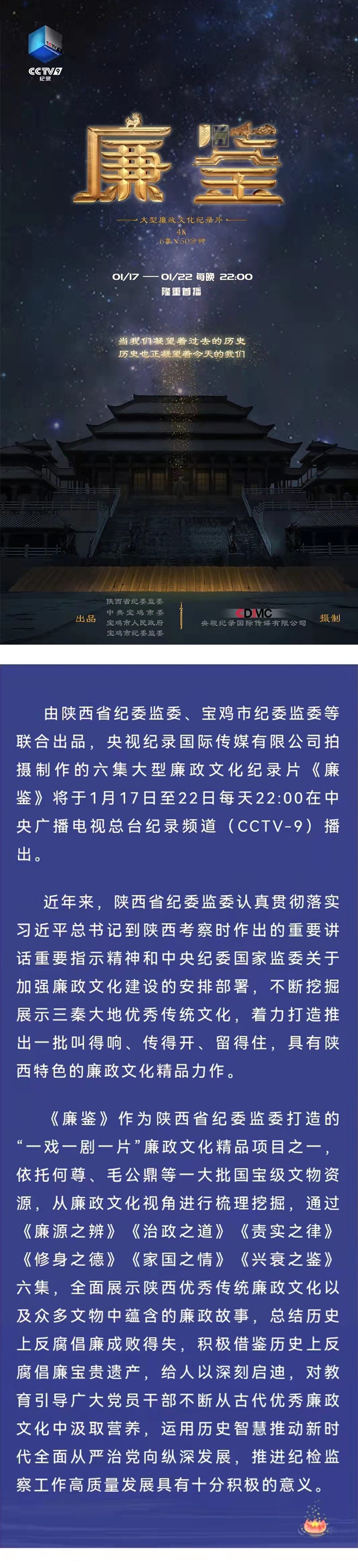 大型廉政文化纪录片《廉鉴》将于1月17日至22日在央视九套播出