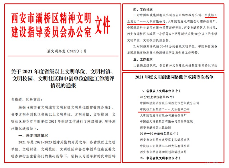 5月5日,公司收到灞桥区文明办《关于2021年度省级以上文明单位、文明村镇、文明校园、文明社区和申创单位创建工作测评情况的通报》,公司作为省级文明单位,年度创建工作网络测评得分97分,成绩优异,获通报表扬。