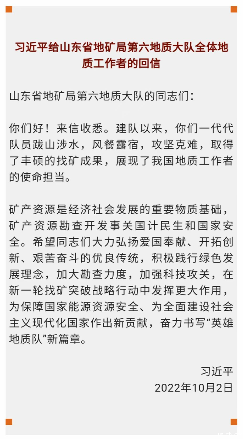 习近平给山东省地矿局第六地质大队全体地质工作者的回信