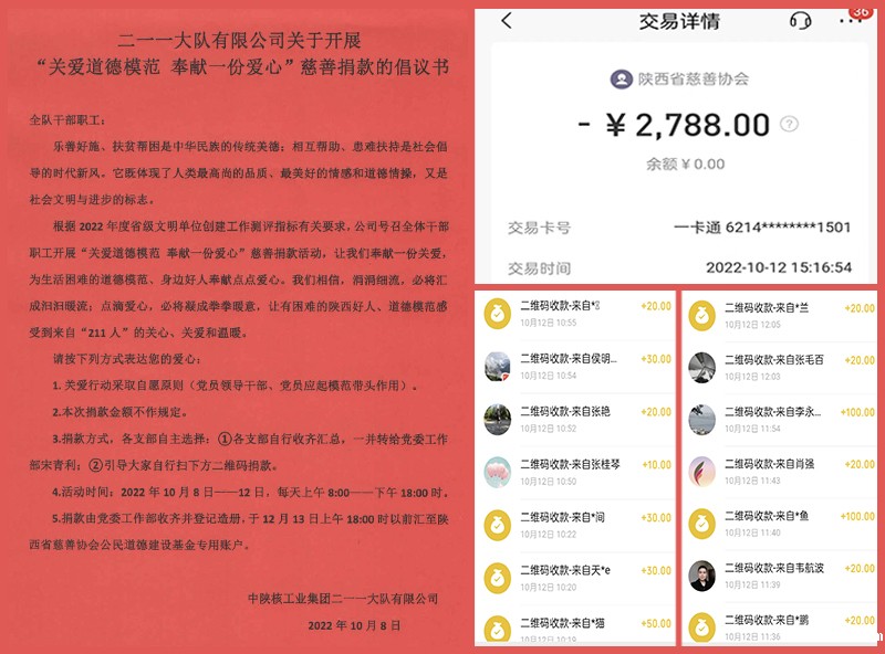 活动结束后,党委工作部第一时间将善款汇入陕西省慈善协会指定账户,为陕西生活困难的道德模范、身边好人献上211人的一份爱心。二一一大队将继续履行好省级文明单位的责任与使命,用实际行动弘扬和践行社会主义核心价值观,为党的二十大胜利召开营造更加和谐稳定健康向上的氛围。