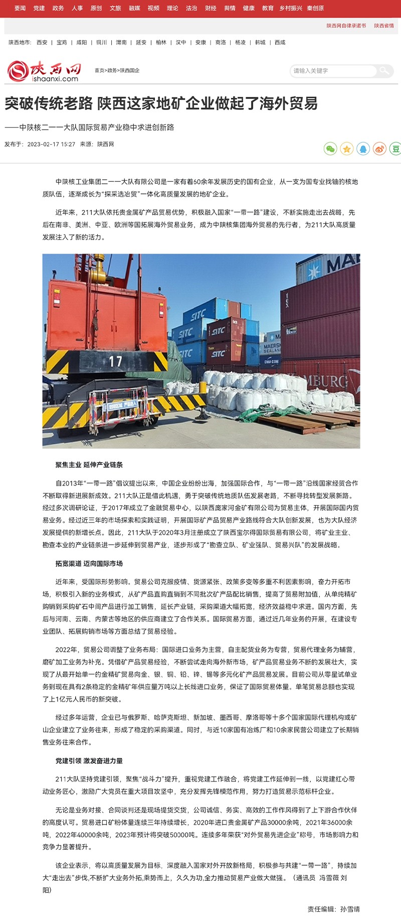 【媒体关注】陕西网 | 突破传统老路 陕西这家地矿企业做起了海外贸易