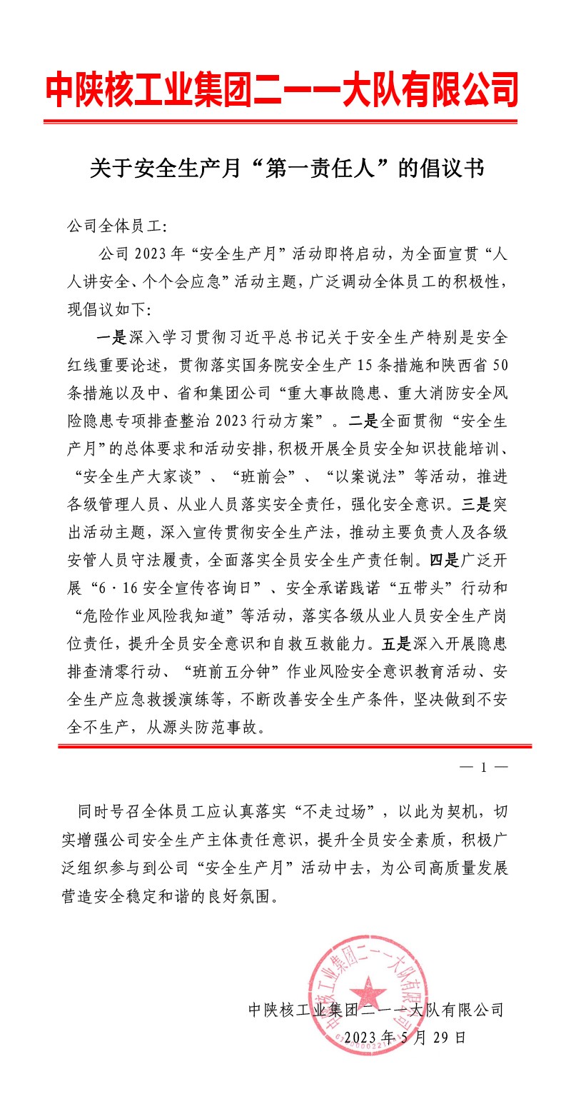 关于安全生产月“第一责任人”的倡议书