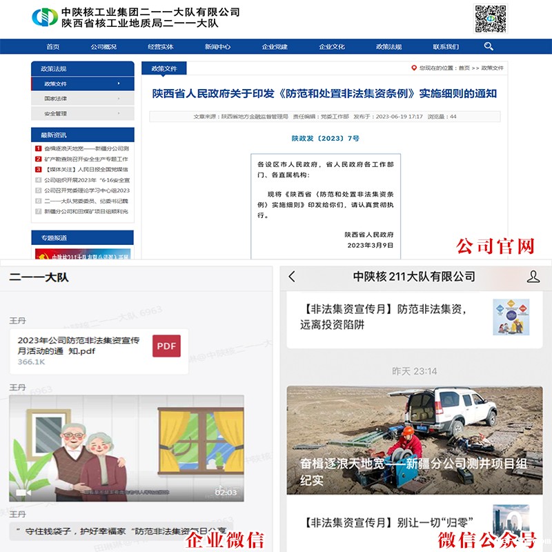 线上,组织开展了防范非法集资短视频投票及知识答题活动,通过企业官网、微信公众号、企业微信群推送防范非法集资小知识。线下,通过机关办公楼电子屏滚动播放宣传标语、在211大队小区悬挂横幅、张贴海报,以及组织志愿者到周边住宅小区向过往群众分发“防范非法集资,共建和谐社会”宣传单等形式,引导群众特别是老年人,认清非法集资的本质和危害,增强理性投资意识,警惕高息回报诱饵,谨防上当受骗,守护好自己的“钱袋子”。