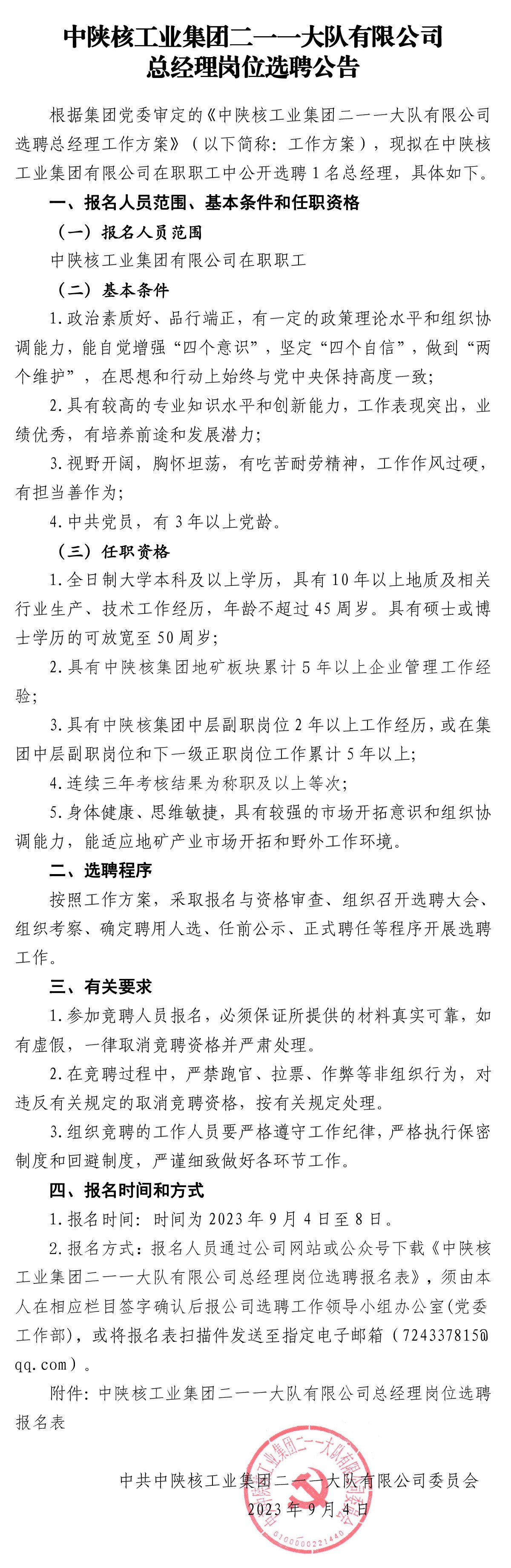 公司总经理岗位选聘公告