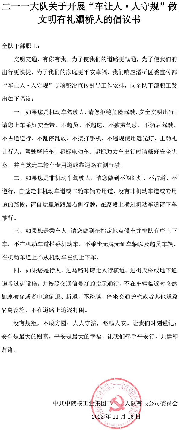 二一一大队关于开展“车让人·人守规”做文明有礼灞桥人的倡议书