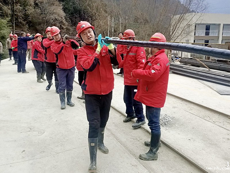 30日上午,在“加油”“再加把劲”等一声声鼓劲当中,庞家河金矿及工队上百号职工从一号矿山西山矿台开始向1110—980中段扛送电缆。只见身穿红色棉服的职工们,不畏严寒、不辞劳苦,一个接一个的扛起电缆进硐下坡,直到矿山的核心。一根粗大的电缆被一个个红色的身影扛起,就像黑色绳子上均匀的串着红色的珍珠,更像是连接大家内心的无尽桥梁,让全矿上下心往一处想、劲往一处使,众人划桨开大船。