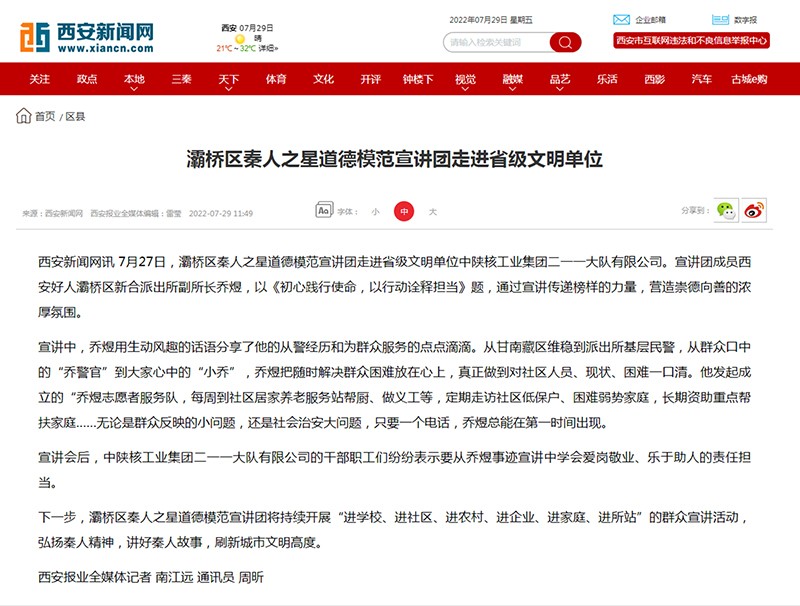 【媒体关注】西安新闻网 | 灞桥区秦人之星道德模范宣讲团走进省级文明单位