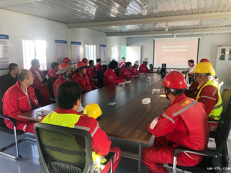本次演练模拟了挖机驾驶员在作业过程中引起作业面坍塌、设备部分被埋、驾驶员受伤且被困在驾驶室内的事故。事故发生后,现场管理人员及时向调度室汇报情况,调度室马上向公司应急救援指挥部汇报,随后启动应急程序进行救援,同时向阜康市应急管理局、瑶池能源和科盟监理汇报事故情况。接到报告后,迅速启动煤田灭火工程边坡滑坡应急响应预案,总指挥王磊,副总指挥武永斌、红十字会王建冲以及抢险救援组、技术咨询组、后勤保障组、医疗救护组、安全保障组、事故调查组等应急小组及携带专业设备,火速赶赴现场。