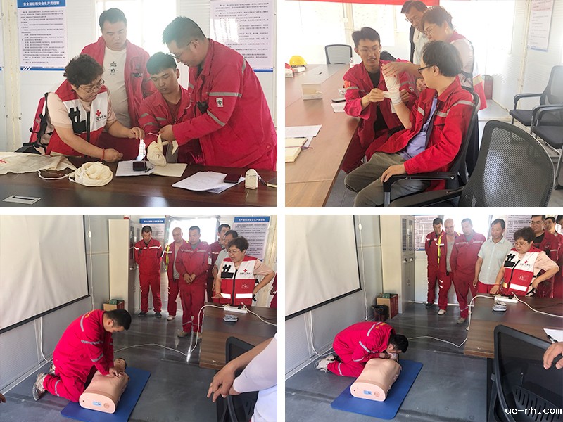 演练完成后,红十字会人员在项目部进行了培训,通过模拟真实场景,详细示范、讲解了心肺复苏(CPR)、海姆立克急救法、创伤止血包扎等实用技能。项目部所有人分组实操,相互配合,反复练习,讲师现场一对一指导,纠正手法和操作细节,确保每位成员都能熟练掌握急救要领。