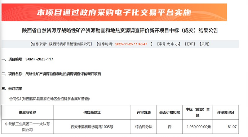 近日,陕西省政府采购网发布“陕西省自然资源厅战略性矿产资源勘查和地热资源调查评价新开项目中标(成交)结果公告”,二一一队矿产勘查院凭借雄厚的技术实力、专业的服务方案和卓越的团队声誉,在众多竞争者中脱颖而出,成功中标采购包1“陕西省凤县童家庄地区金铅锌多金属矿普查项目”。该项目的中标,是矿产勘查院在地质勘查领域核心竞争力的又一次有力彰显,同时为公司高质量发展注入强劲动能。