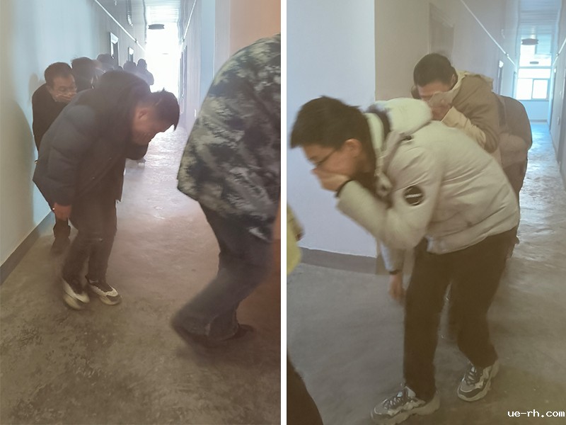 理论宣讲结束后,在宿舍楼模拟因电气线路故障引发火灾的场景,浓烟通过楼道扩散,迅速蔓延。宿舍职工按照应急预案,用手或湿毛巾捂住鼻口,低姿弯腰右行,沿制定的疏散线路有序撤离。