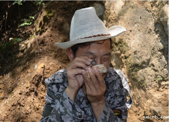 历经两个多小时崎岖的山路,我们终于到了目的地。杨队长顾不上休息,立即勤敲细打,仔细研究起来,从远看到近看,再从近看到远看、拿着岩矿石标本头顶烈日聚精会神的观察、仔细的查看着每一处蛛丝马迹,项目负责肖强在一旁详细地介绍着该地区地质情况以及工作情况。通过仔细观察研究,杨队长总结了该地区的地质特征,提出了许多非常宝贵的建议,并对下一步工作进行了指导。